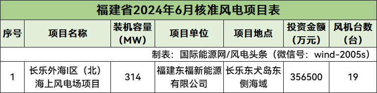 福建核準1個風電項目,總規模314MW,為海上風電項目。