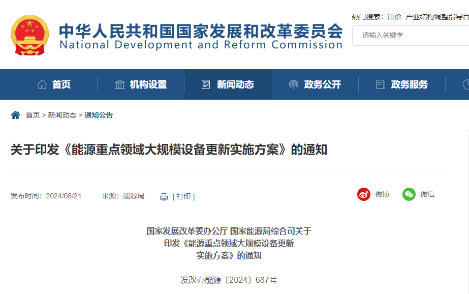 為貫徹落實國務院《推動大規模設備更新和消費品以舊換新行動方案》(國發〔2024〕7號),推動能源重點領域大規模設備更新和技術改造,國家發展改革委、國家能源局組織編制了《能源重點領域大規模設備更新實施方案》?,F印發給你們,請認真組織實施。