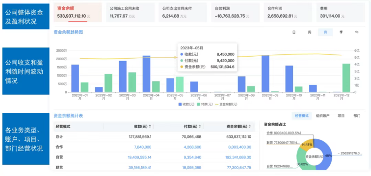 “管資本”的第一步,是得看清資本花在哪、賺在哪。紅圈先給所有項目建了一套“統(tǒng)一數(shù)據(jù)標準”——不管是項目現(xiàn)場的施工日志、材料采購單,還是分公司的資金流水、合同臺賬,所有數(shù)據(jù)都從“源頭”在線生成,實時同步到集團云端,中間沒有任何人工“加工”環(huán)節(jié)。這意味著什么?你在總部辦公室,打開系統(tǒng)就能像“做CT”一樣,直接“穿透”到任何一個項目的任何一張單據(jù):想查某項目的鋼筋采購成本,能看到每一筆采購的供應(yīng)商、單價、付款時間;想知道某項目的資金余額,能實時看到賬戶流水,連一筆小額報銷都不會漏;想盯進度,能看到現(xiàn)場每天上傳的施工照片、進度填報,是不是真的“達標”,一眼就懂。數(shù)據(jù)不再是“二手貨”,資本效益的真實情況,清清楚楚、明明白白??偛考饶芸慈帧许椖康恼w盈利、資金總盤子,也能抓細節(jié)——單個項目的成本超支、資金滯后,“管資本”終于有了精準的“依據(jù)”。